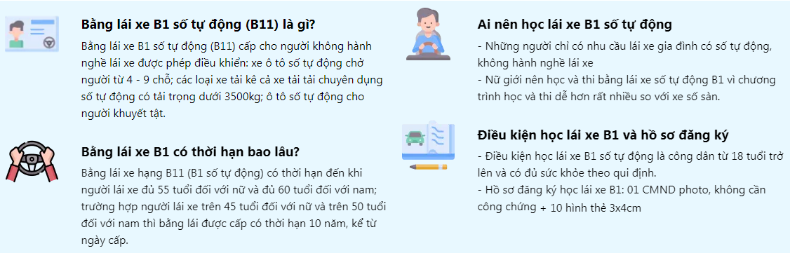 Đào tạo lái xe hạng B1 hay gọi tắt là học lái xe B1 là chương trình học lái xe ô tô số tự động hoàn toàn nên dễ học và dễ thi đậu nhất hiện nay. Học lái xe ô tô hạng B1 được những người chỉ có nhu cầu lái xe gia đình không kinh doanh vận tải lựa chọn. Xu hướng sản xuất xe gia đình đa số là các xe số tự động, nên việc học bằng B1 là phù hợp cho đa số nữ giới và nam giới chỉ có nhu cầu lái xe gia đình, không xác định hành nghề lái xe chuyên nghiệp.