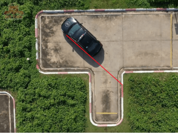 Ở bài này, bạn để ý vai người lái trùng với góc vuông thì đánh hết vô – lăng sang phải và lùi xe vào chỗ đỗ đến khi xe nằm ở góc 45 độ so với đường thẳng của vỉa hè hoặc nhìn vào gương chiếu hậu trái sao cho xe mình và mép phải xe sau nằm trên 1 đường thẳng.